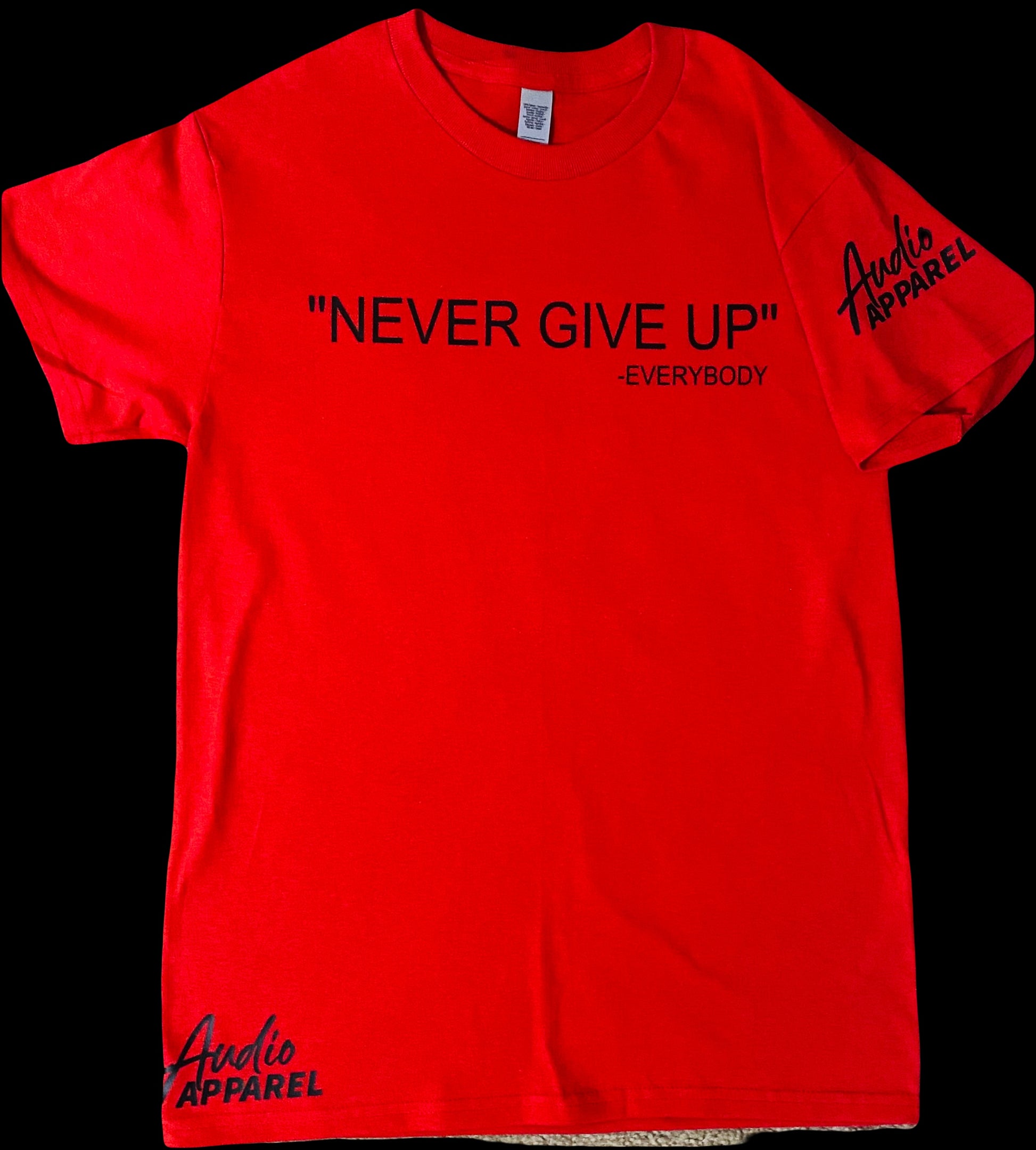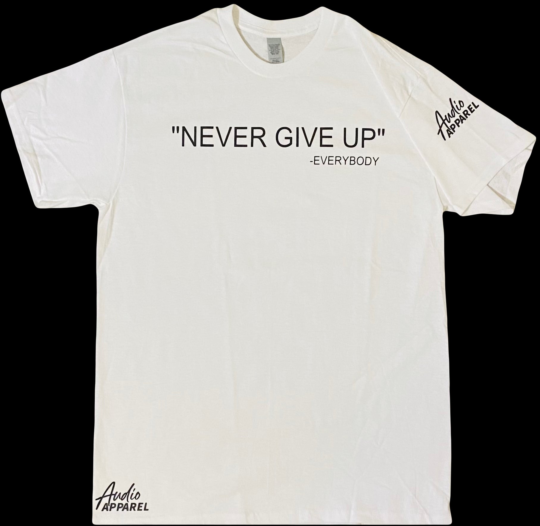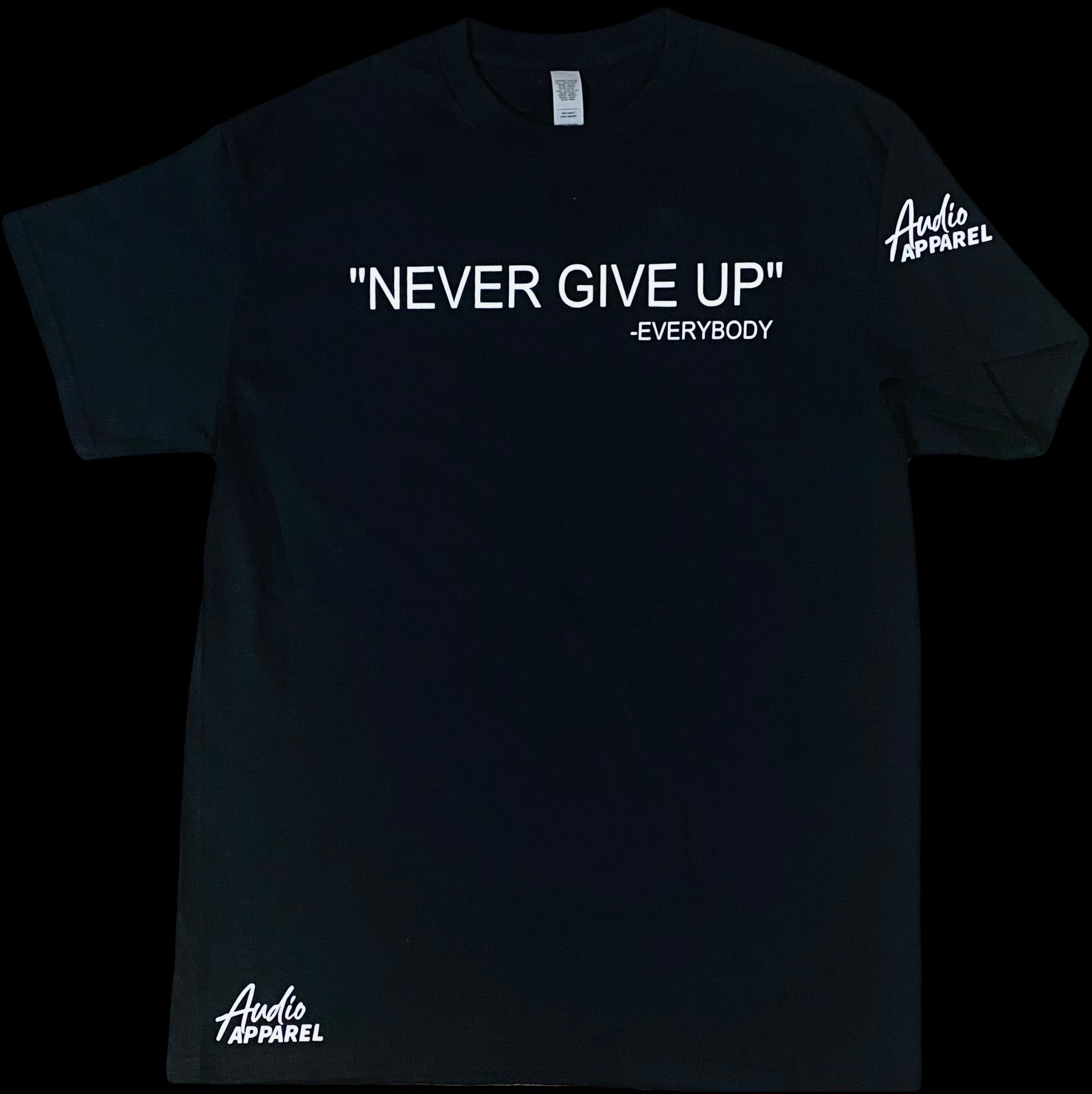 The Audio Apparel "Never Give Up" short sleeve shirt combines style and inspiration. Crafted from soft, breathable fabric, this shirt features the brand's signature motto emblazoned across the chest, serving as a constant reminder of resilience and determination. Perfect for everyday wear, it offers both comfort and a powerful message to keep pushing forward. 100% cotton.